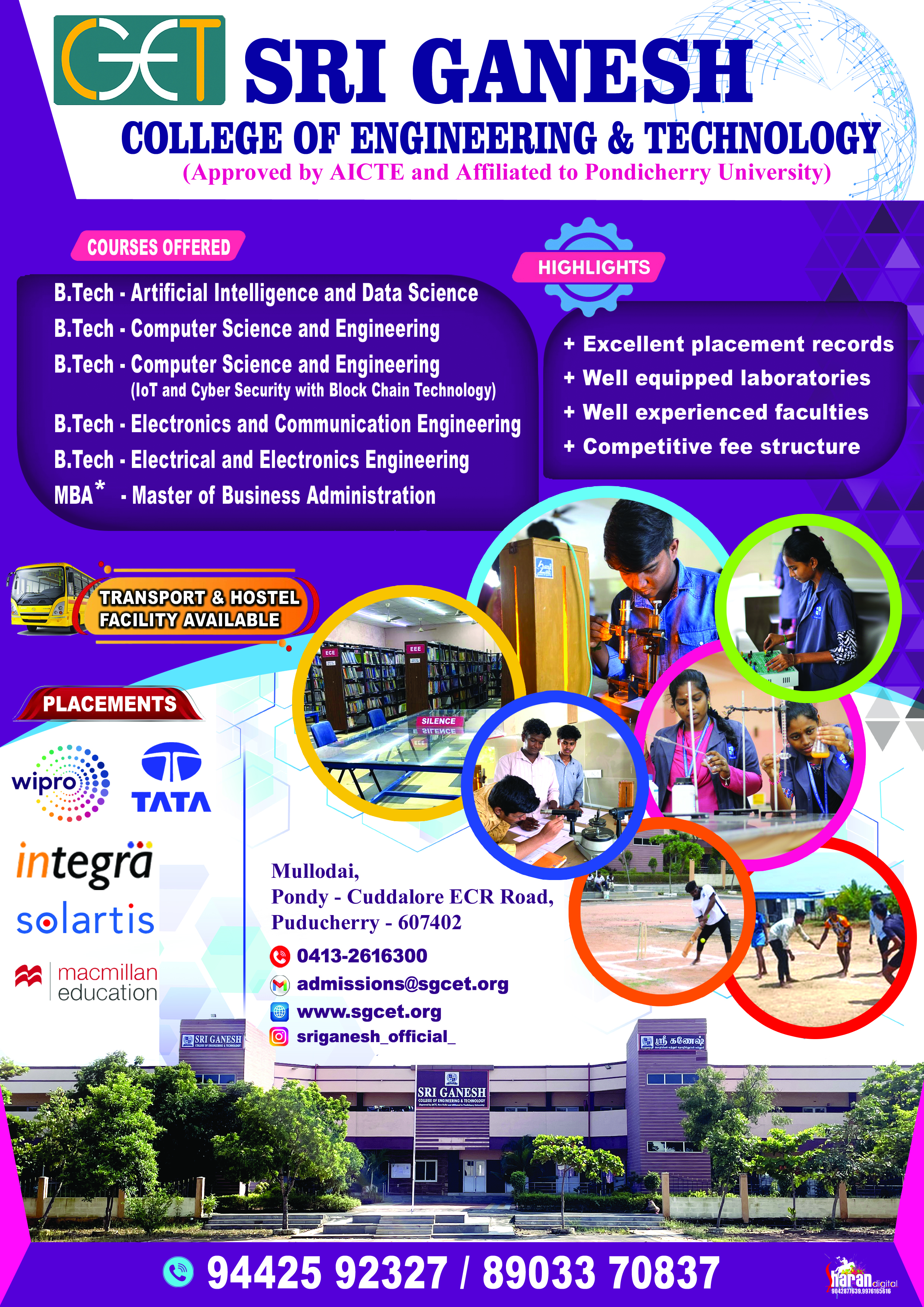 Performance on the Higher Secondary Certificate test or an equivalent qualifying exam determines admission to Sri Ganesh College of Engineering and Technology's engineering programs.