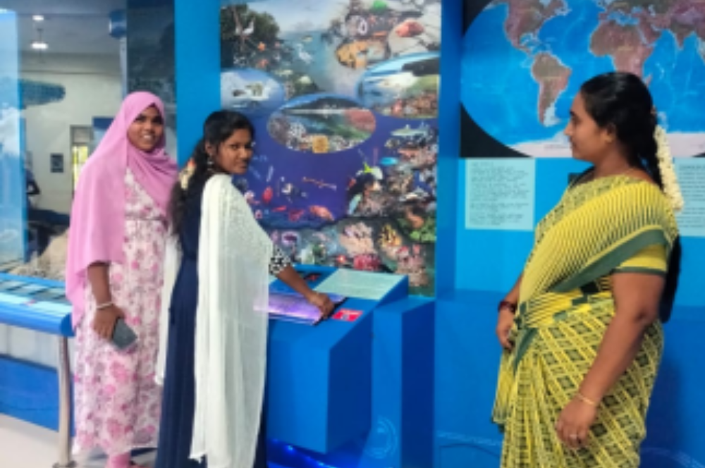 Students enthusiastically participated in interactive activities – pressing buttons, rotating models, and exploring displays to see how marine ecosystems work. The exhibit on marine pollution made everyone reflect on the impact of human activities like oil spills and plastic waste on ocean life.